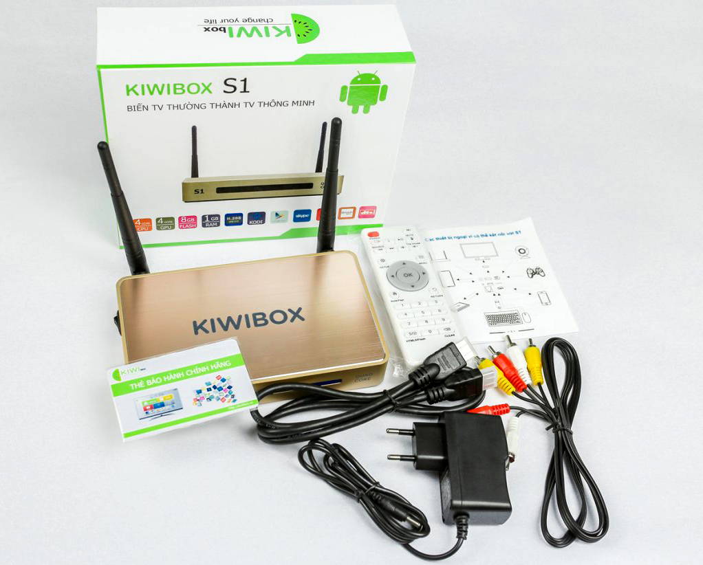 Ngoài hai Anten sóng ở hai bên, Kiwibox S1 có gần như đầy đủ các cổng kết nối cần thiết ở mặt sau : Cổng AV hoa sen, hai cổng USB 2.0, cổng LAN cùng ngõ HDMI và chân nguồn. Tất cả các cổng kết nối nằm ở đằng sau cũng sẽ dễ dàng hơn trong việc giúp bạn sắp xếp Box ở đằng trước và không để lộ một số đường dây đằng sau nó.
